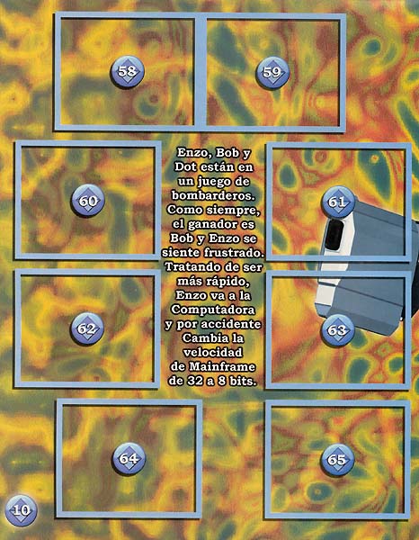 | Enzo, Bob and Dot are in a bombing game. As always, the winner is Bob and Enzo feels frustrated. Trying to be faster, Enzo goes to the Computer and accidentally changes the speed of Mainframe from 32 to 8 bits. |