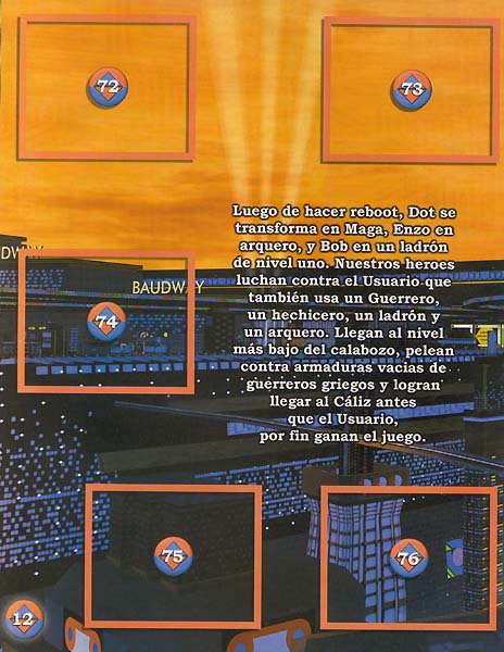 | Then when they reboot, Dot is transformed into a Mage, Enzo into an archer, and Bob into a level 1 thief. Our heroes fight against the User who also uses a Warrior, a wizard, a thief and an archer. They arrive at the deepest level of the dungeon, fight against empty armor of Greek warriors and reach the Chalice before the User, finally winning the game. |