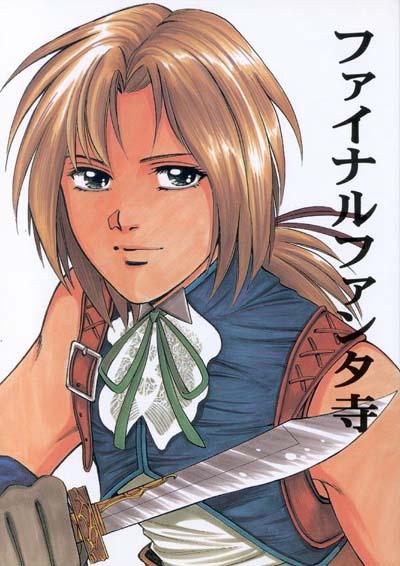 Here's a cute grab bag of gags and art styles. The gags are all short, ranging from four panels to several pages in length. In one, Steiner is running to Garnet's rescue, then he imagines what might be happening between Freya and Beatrix and rushes right back. (The guy has an overactive imagination. Comes of being rusted into a tin can, I suppose.) In another, Eiko overhears Zidane and Vivi's "male bonding" in Madain Sari, and gets very upset when she misunderstands what's happening. (Hmm, I think I see a theme here.) Zidane's chocobo hammers a moogle while playing Hot & Cold, something I've tried to do myself. There are also some pages where someone wearing a chocobo costume - supposed to be the author, maybe? - reacts to various aspects of FF9 and other FF games.