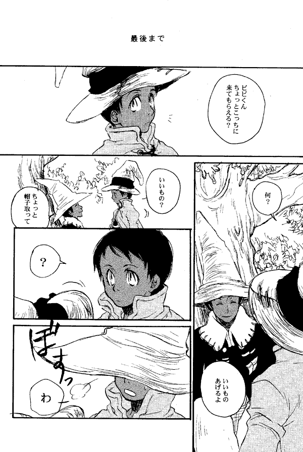 The two stories here are about the ends of people's lives. The first is about Vivi and Mr. 288, both of whom now have visible faces. (So do the other Black Mages who make a cameo in one panel.) Mr. 288's health seems to be deteriorating, though he's trying not to show it. He and Vivi talk quite a lot, and Vivi seems to be keeping watch over him. At the end Mr. 288, who looks tired but cheerful, calls Vivi over to where he is sitting against a tree and gives Vivi a "gift" - his hat. He then says "Iikatta. Boku wa 'happy end' da" ("It was good. My life has a happy ending," more or less.) and passes on.
