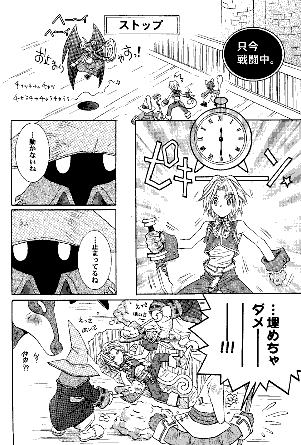 This doujinshi is mainly gags based on the events of the game. Eiko puts her jewel in her ear and afterwards cannot hear (a la "I can't hear you, I have a banana in my ear!"). Dagger cuts her head off instead of her hair and stands there like a horror movie monster, holding her head by its hair while blood fountains out of her neck. Ash casts "Stop" on Zidane, and Black Mages see that he's no longer moving and start burying him while Vivi protests. Dagger cuts her hair, then puts a small bomb on her head and covers it with a bucket, which results in a perm. Vivi also gets a perm - which, in his case, means that the tip of his hat is curled into a little spiral.
