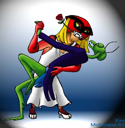 Two To Tango (or, My Mantis Looks Dashing in a Tux) This drawing, based on the cover of a "Lobo" comic book, bubbled to the surface at 3:00 AM after watching several hours of Cartoon Planet with some friends. This may prove that Cartoon Planet is a hallucinogenic substance.