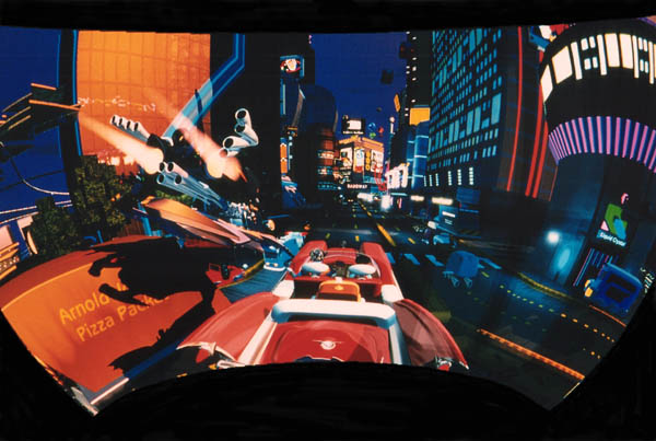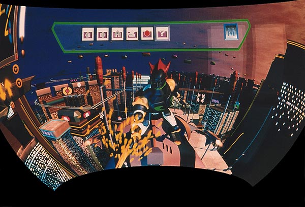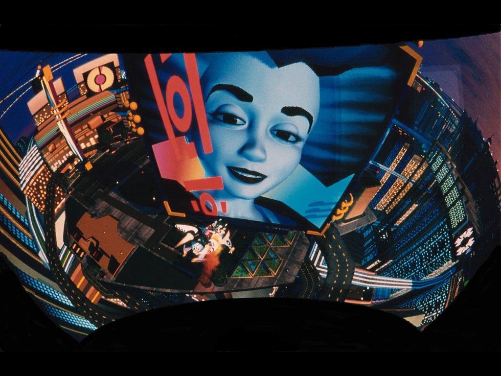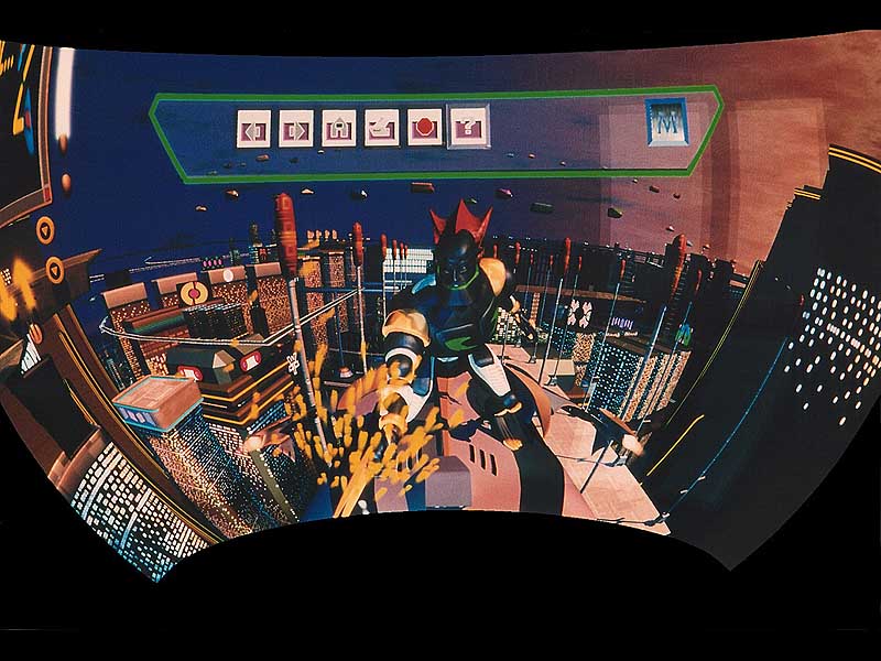 1997. Viewers sit in an 18-passenger vehicle mounted on an orthagonal motion