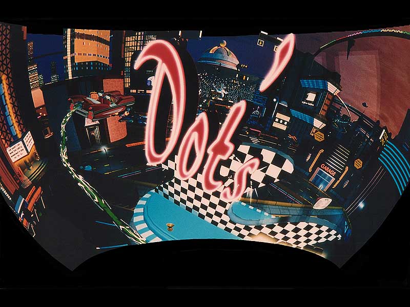 Of course, Bob zips in to save us. What follows is a chase through Mainframe in which there are so many details you can never catch them on the first go. (A Bob Dobbs binome, a statue of Bob fighting Gigabyte, and the Smalltown Binomes are a few of the things that flash by.) The vehicle even goes bumping down a flight of stairs and is swung around at the end of something like a giant rubber band, and... well, I was glad the seats had handles to grip onto, and wished it had seatbelts as well. Eventually we reach safety, but not before seeing Megabyte do an impression of a bug on the windshield.