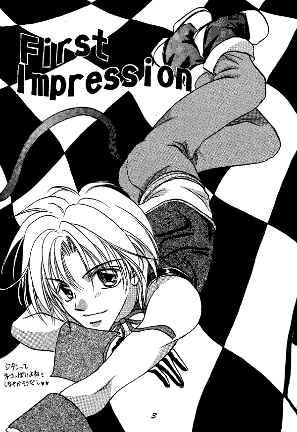 The first story in this manga stars Zidane and Blank. It's a talky one, with little action - in fact, the most action is when Zidane picks up a glass with his tail! - so I can't say much about it, really. The second story is also talky, first with Zidane and Salamander, then Salamander and Freya.