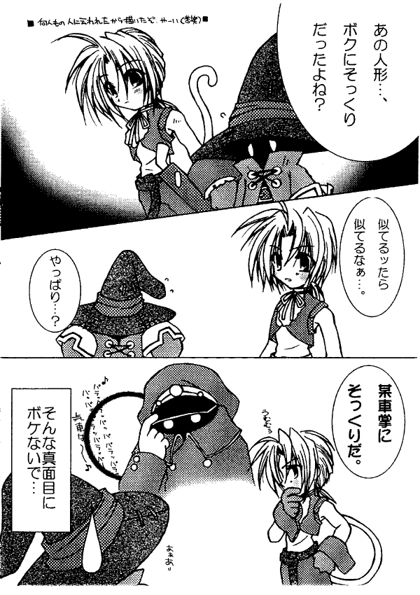 This doujinshi is a collection of one-page gags. Vivi is invited to play jumprope, and ends up wearing the rope-holders out. Zidane imagines a Black Mage in what looks like a ship captain's uniform. And so on. The artwork is not bad. The gags center on Zidane, with Vivi, Salamander, Eiko, Lani, and Kuja filling out the rest of the cast.
