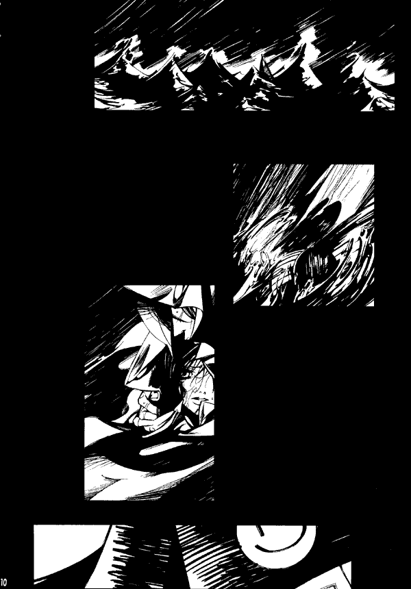 Moving along, the first four pages are in color, which is not common. The fourth page is a striking image by Shiro of Black Waltz #3 with a human face. The stories and gags within the doujinshi vary wildly in terms of style and tone; there are silly gags (for instance, the usual "snatch Vivi's hat" gag, this time showing he's a conehead), artsy parts such as a very stylized three-pages showing Garnet's flashback to the boat in the storm, pinups, and "WTF?" pages, such as the one in which Zidane has visions of Steiner and Salamander in fedoras.