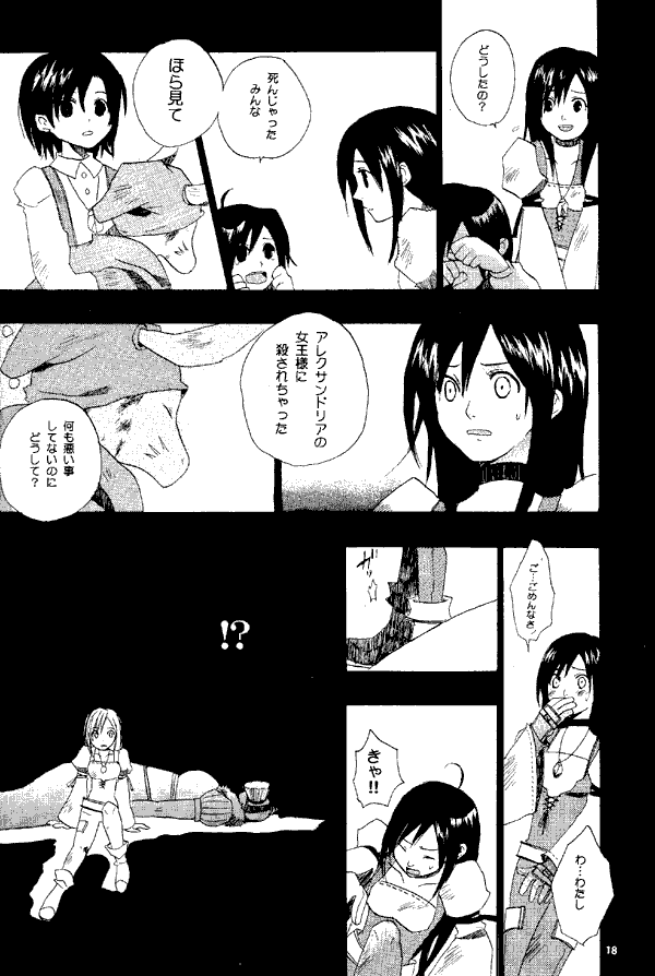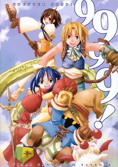 The doujinshi starts off with a gag about Zidane equipping a ribbon for the stat boost, and afterwards being followed around by a butch-looking moogle. In another, the four-armed man tries to smarm Eiko. She has Fenrir punch him into the sky. There are also some interesting sketches of Zidane and Garnet using FFX2-style dress spheres. Zidane in a Type B Black Mage outfit, hmm!