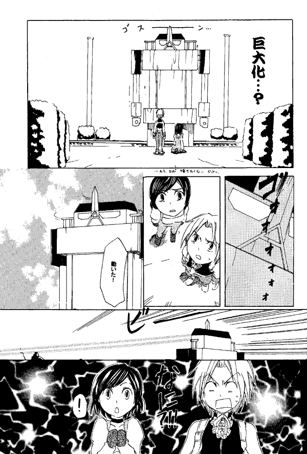 This doujinshi is named after a blocky, toylike... thing. At first it's just blocks lying on the ground, looking like a partly assembled toy. Later on it's put together, and for some reason Zidane throws it into a fountain... and moments later it rises out of the water, now about 20 feet tall. And then a dragon carries it off. Later on Kuja is seen controlling another large goofy-looking mechanical creature with a game controller...