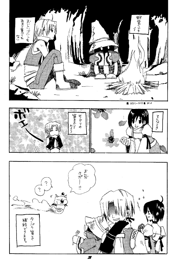 There are lots of other gags and other situations in this doujinshi. Zidane and Baku play cards, Kuja enslaves Zidane by threatening his friends - but not to get a significant magical artifact for him; he makes Zidane get groceries. In the final gag, the party is camping out and have no food, so they call a moogle...