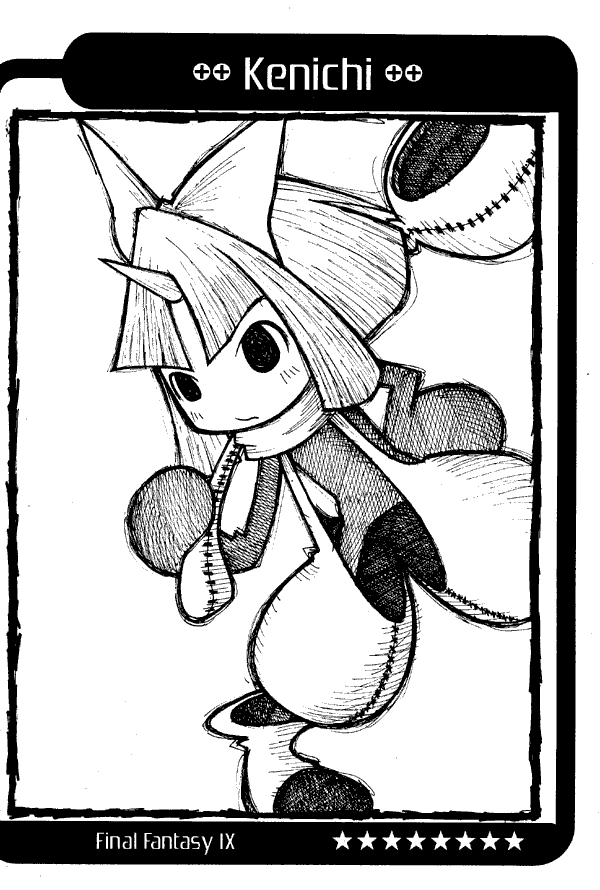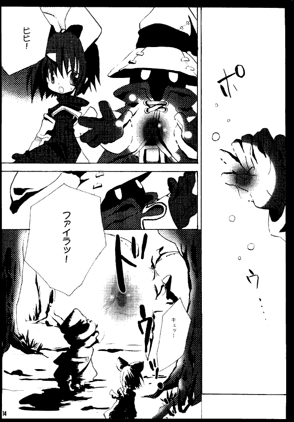Here's a good doujinshi for fans of Eiko and Vivi. In the story, Eiko walks away from Zidane and finds Vivi. They squabble a little - Well, Eiko fusses at Vivi, who takes it until Eiko relents - and they survive an encounter with a particularly ugly monster. And then there's more talking. After a little interlude, Zidane and Garnet are there, and Eiko has Vivi's hat. Zidane and Garnet appear afraid to tell Eiko what the implications of that are (whenever you see Vivi's hat minus Vivi in a doujinshi, that usually means he's dead) but she is bright and cheerful, and goes off with Vivi's "children."