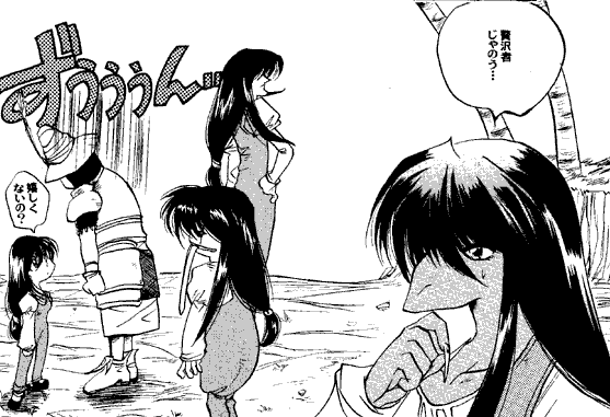 This is a well-drawn doujinshi with some gags on themes I haven't seen before. In one, Garnet dreams of the "eye in the sky" that destroyed her home - and it resolves into Steiner's face. Kuja, after painting his nails, calls to his Black Mage servants for his usual mascara, and in the next panel you see them painting the lashes around the Invincible's eye. There's one gag that I can't make out the lead-in to, but the final panel is peculiar enough - Vivi, Quina, Salamander, and Freya as Garnet lookalikes (kinda) - that it's funny anyway. There's a gag involving the four-armed man, and a longer humorous story on which Ruby is a fearsome strange director, that I can't figure the story out for, but the art is good enough to make them worthwhile. And then there are a few nifty pinups among the info pages.