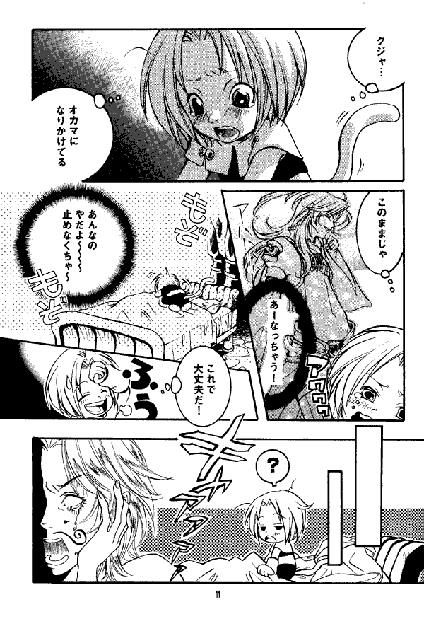 There are two stories in this doujinshi. One is about Kuja and Zidane as young Genomes. They have a sibling-like relationship, with Kuja watching out for his cute little brother. Zidane starts having visions of the adult Kuja, and, fearing that he will grow up "unmanly," draws moustaches on his face while he's asleep. (Hey, Zidane's only four years old at the time - it makes sense to him!) After the second time this happens, Kuja has had enough and tosses him down to Gaia. The second story is about Zidane, Blank, and Ruby. Zidane and Blank are always together, and Ruby seems to assume that they're more than "just friends," which Blank emphatically disputes.