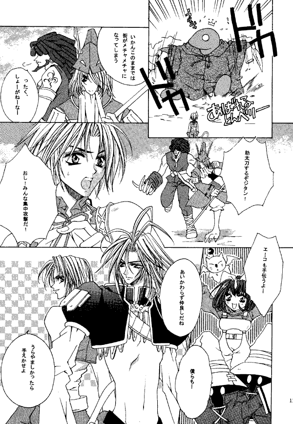 As is probably obvious, I liked the third story the most among the serious ones. I've already seen several other stories based on the "You're Not Alone!" and rescue-of-Kuja scenarios, and as these looked like the same thing, plus as most of the time had more speech bubble than action, they didn't grab me. I liked the last one, but since I'm a fan of the Black Mages that's to be expected. The artwork in this doujinshi is nice, but the characters tend to have such long, long torsos that they make me think of daschunds.