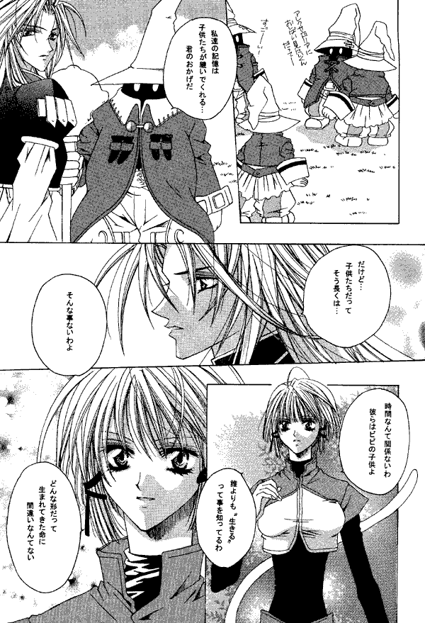 This story begins with a Hunting Festival set after the events of the game. The entries are, in order of appearance: Eiko, Vivi's children, Kuja, Zidane, Freya, and Salamander. When the boss monster comes out, Garnet jumps into the action, and everyone battles... a tonberry king. Quina appears after the battle is over and they're trying to figure out how to divvy up the points, presumably to cook the tonberry for dinner. After this are several serious stories. One revisits the "You're Not Alone!" sequence, in another Zidane goes into the Iifa Tree after Kuja, and in a third Kuja visits the Black Mage village, which is populated by Vivi's children, a much older Mikoto, and one Type C Black Mage.