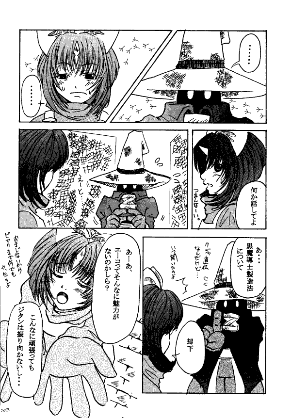 This doujinshi is pretty talky. A lot of the story panels are "talking heads," in which you see the upper part of a character or two and what is being said. The first is a conversation between Zidane and Mikoto, with Vivi playing a smaller part. In another Zidane helps Steiner find a gift to give Beatrix at their dockside rendezvous. The most animated story is a conversation between Eiko and Vivi. Of course Eiko is going to get dramatic when she talks!