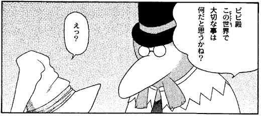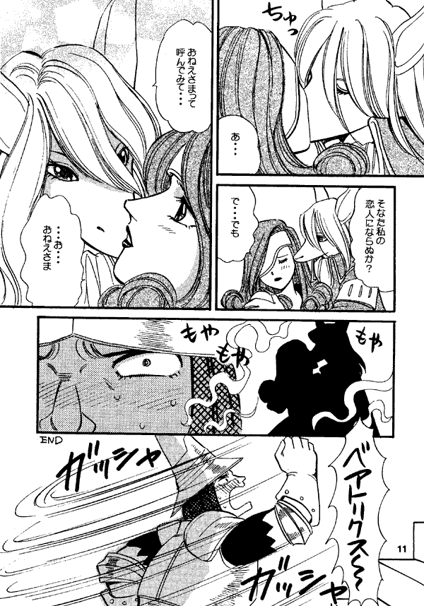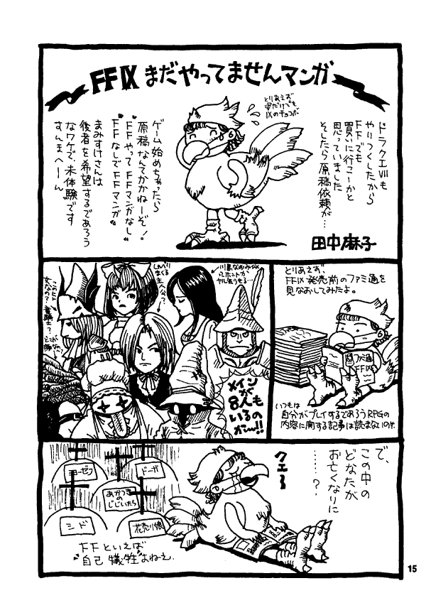 Here's a cute grab bag of gags and art styles. The gags are all short, ranging from four panels to several pages in length. In one, Steiner is running to Garnet's rescue, then he imagines what might be happening between Freya and Beatrix and rushes right back. (The guy has an overactive imagination. Comes of being rusted into a tin can, I suppose.) In another, Eiko overhears Zidane and Vivi's "male bonding" in Madain Sari, and gets very upset when she misunderstands what's happening. (Hmm, I think I see a theme here.) Zidane's chocobo hammers a moogle while playing Hot & Cold, something I've tried to do myself. There are also some pages where someone wearing a chocobo costume - supposed to be the author, maybe? - reacts to various aspects of FF9 and other FF games.