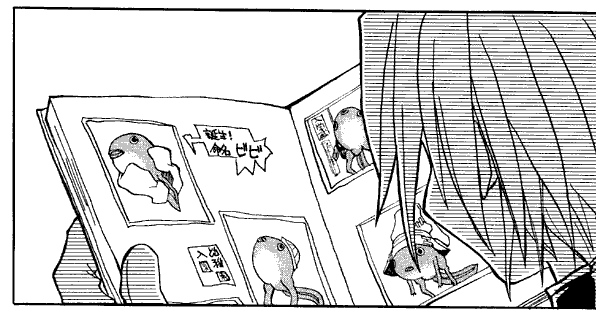 My favorite gag, however, is one I'd seen previewed in JPQueen's catalog of unavailable doujinshi, and I thought I was able to interpret it despite the low resolution of their image and the inevitable language problem. As it turns out, I had it right. While cleaning out the cave in which he used to live, Vivi finds his grandfather's old memory album and shows it to Zidane. It contains Vivi's baby pictures - and he started out as a tadpole. Whether that means that Vivi is a frog, or just is froglike, I'll leave up to imagination. (I figure that Qu are pretty froglike, myself, and thus maybe they start out as swimmers before they crawl out of the water in search of something better to eat than pond scum.)