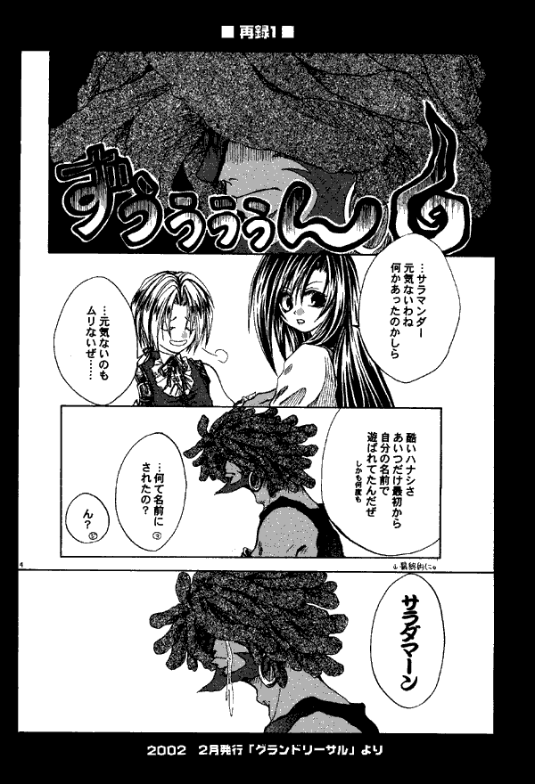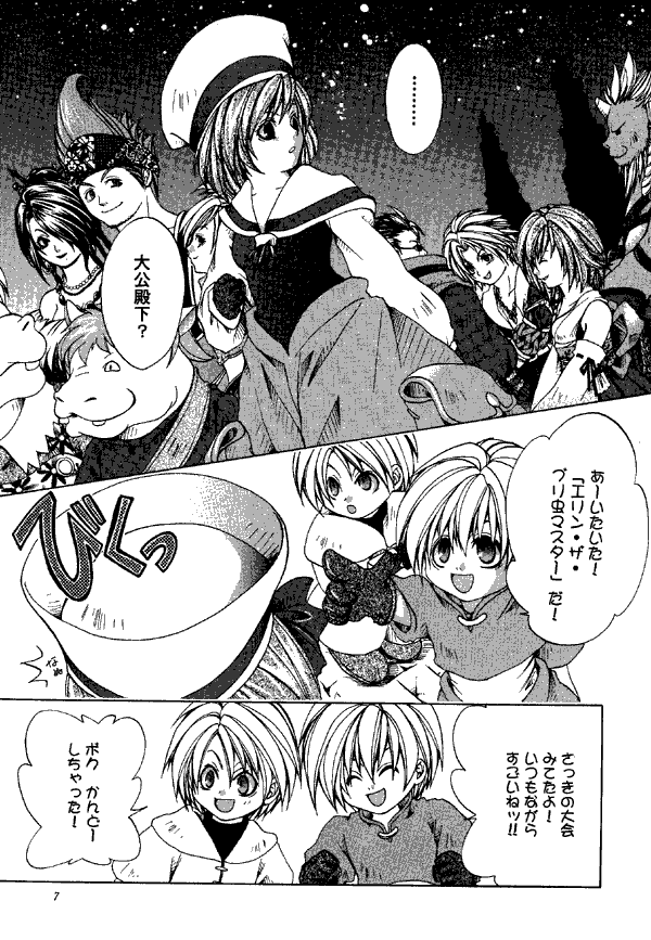 Here is the followup to Explanations's Grand Lethal. It has some gags in the same areas - Erin (the "Oglop Master") is given a prank gift from her admirers... and in the box are some oglops. There is a gag about Eiko's cooking, one in which Mog inflates Eiko's wings so she can fly by blowing on her horn, and then a few pages about a pair of women that I believe represent the doujinshi creators. This doujinshi also includes two repeat pages from the first issue - I recognized the "Sad Man" tweak on Salamander's name right off, and on second inspection I saw that there's a gag with Zidane, Kuja, and Quina that appeared in the first one as well. (Both repeat pages were black bordered. Hmm?)