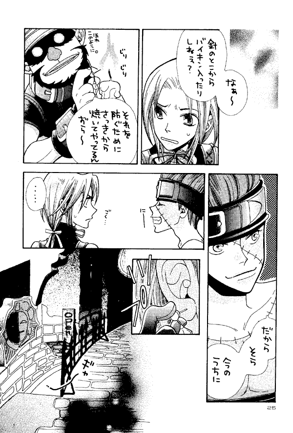 I was a little hesitant when I first saw this doujinshi. The cover lists the pairings "Salamander x Zitan" and "Steiner x Vivi," and the back cover shows Zidane getting affectionate with Salamander. Worse, Zidane is drawn slightly girlishly, with blush in his cheeks and reddened lips. That, in other doujinshi, has been a hint of un-innocent activities between the covers. However, this time the alarms were false ones. There's one very light kiss (Salamander-Zidane) at the end, and even that seemed to be a joke, just meant to startle Zidane. There's no implication of anything stronger than that going on. As far as Steiner and Vivi go, the cover must be referring to the text story, because there's nothing else involving them together.