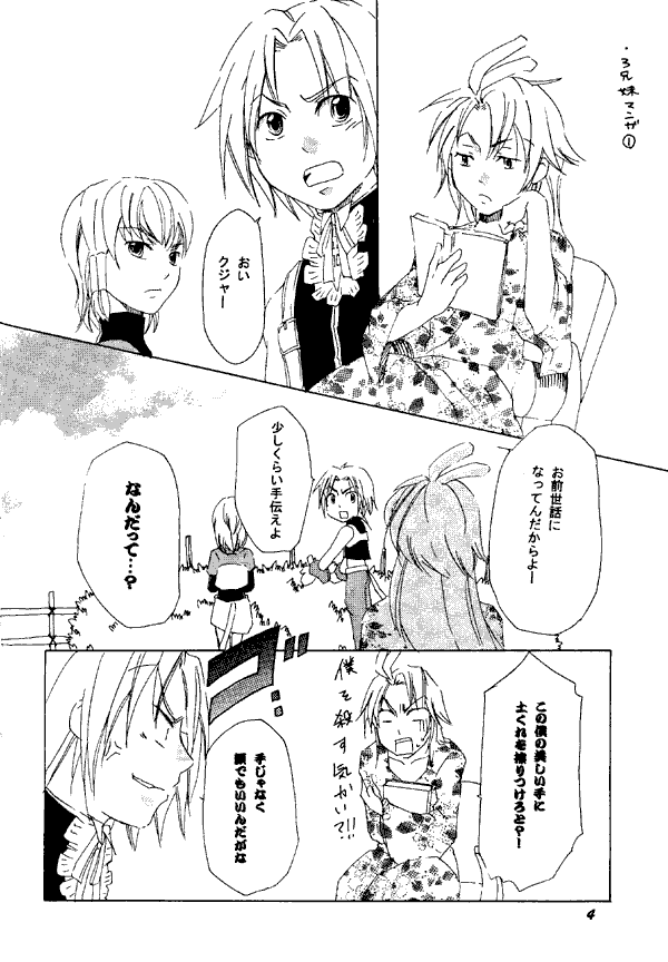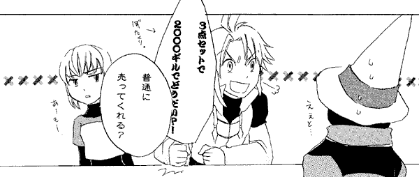 This doujinshi starts out with a number of gags. I haven't managed to translate them - they're talky ones, and the gag is not conveyed by the pictures. But it's fun stuff to look at. Kuja loafing around in a robe in the Black Mage (and Genome) village, Garnet summoning Bahamut and intimidating the Tantalus crew, Kuja haggling with a Black Mage shopkeeper. In a serious story, Zidane gives Garnet a necklace with two pendants, one a cross and the other not drawn clearly enough for me to identify. This appears to be in the first half of the game, as Garnet's not wearing her usual pendant.