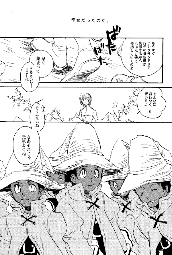 The two stories here are about the ends of people's lives. The first is about Vivi and Mr. 288, both of whom now have visible faces. (So do the other Black Mages who make a cameo in one panel.) Mr. 288's health seems to be deteriorating, though he's trying not to show it. He and Vivi talk quite a lot, and Vivi seems to be keeping watch over him. At the end Mr. 288, who looks tired but cheerful, calls Vivi over to where he is sitting against a tree and gives Vivi a "gift" - his hat. He then says "Iikatta. Boku wa 'happy end' da" ("It was good. My life has a happy ending," more or less.) and passes on.