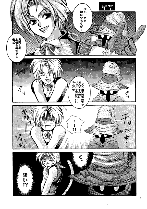 This'll be short and sweet, as I have only been able to translate one of the gags well enough to describe (i.e. spoilerize) it. (The gag in question is about the "male bonding" ritual, and Zidane is startled to see that not only Vivi's face is blacked out.) But, IMO, that's okay - the artwork here is what I like about this book. The cover is fine, though the closer I look at it the less I like Zidane and Garnet's faces. It could be their expressions, or how "blurry" they seem compared to the black ink outlines of the rest of the picture.