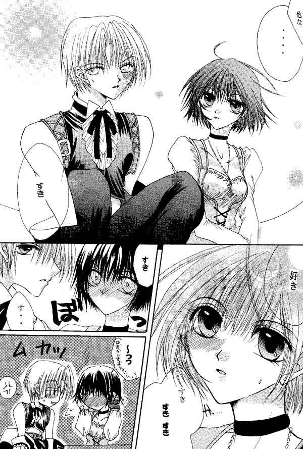 The art doesn't appeal to me that much. The faces look much the same, all owl eyes, pointy chins, haystack hair, and not a lot of variation in expression. Some body parts don't look natural to me, for example Zidane's shoulders and everyone's neck-to-head connection when seen in 3/4 view. And Garnet's corset is quite distracting - nowhere else in this doujinshi do you see the attention to detail that is shown in the fabric folds around Garnet's breasts. Artistic priorities, I guess.