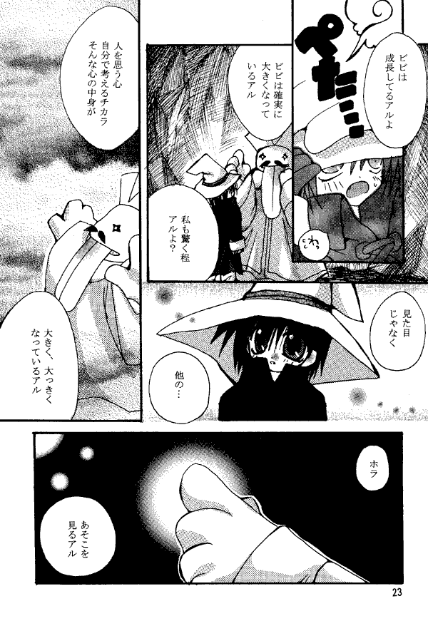 The doujinshi starts off with some short gags. Zidane hears a sweet singing in the night... but, Dagger's in her bed, and so is Vivi, and where's Steiner? Kuja visits the dwarves in Conde Petie and finds their ways - and their cuisine - incomprehensible. Zidane, on first meeting Choco, gets so ambitious that he scares the bird off.