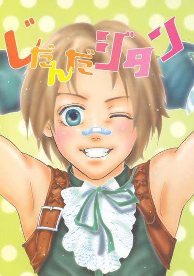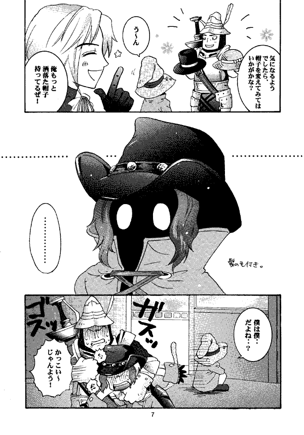 Here we have a short, nicely drawn all-cast gag doujinshi. When Vivi mopes that he looks like the manufactured black mages, Steiner offers a novel solution: new hats. (Vivi as Irvine from FF8?) Zidane's potion does not turn the oglop Cid into a frog, but into... well, a human that seems to be having Kuja's hormone problem. When Zidane comes to Kuja in the desert palace, Kuja greets him... in a bathtub. Thank heavens for conveniently figleafy flowers.