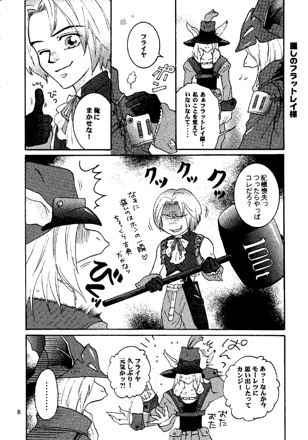 Not all of the gags are intelligible to those not fluent in Japanese, but even then the context is apparent. Freya looks disappointed while talking to Fratley; Zidane threatens Fratley with a "100T" hammer, and suddenly Fratley slaps his forehead and starts talking. It's easy to figure that Zidane is offering to jog Fratley's memory of his lost love.