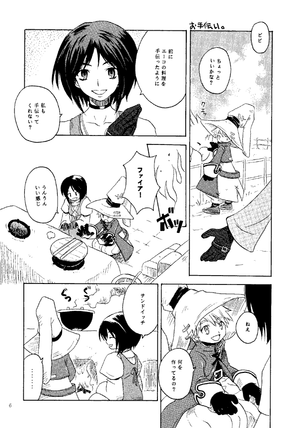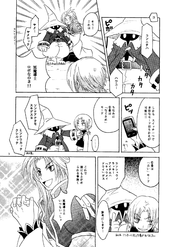 Vivi is drawn as a blond human boy in most of this doujinshi. I seem to be getting a lot of human-Vivi DJs lately. However, the Black Mage servant is not humanized, and Vivi does not appear in that story. I can only think of one DJ in which the rest of the Black Mages were drawn as humans, though human Vivis are fairly common. Also worth noting: Black Mage No. 972 speaks only in katakana and without punctuation, which gives me the impression of an artificial, monotone voice.