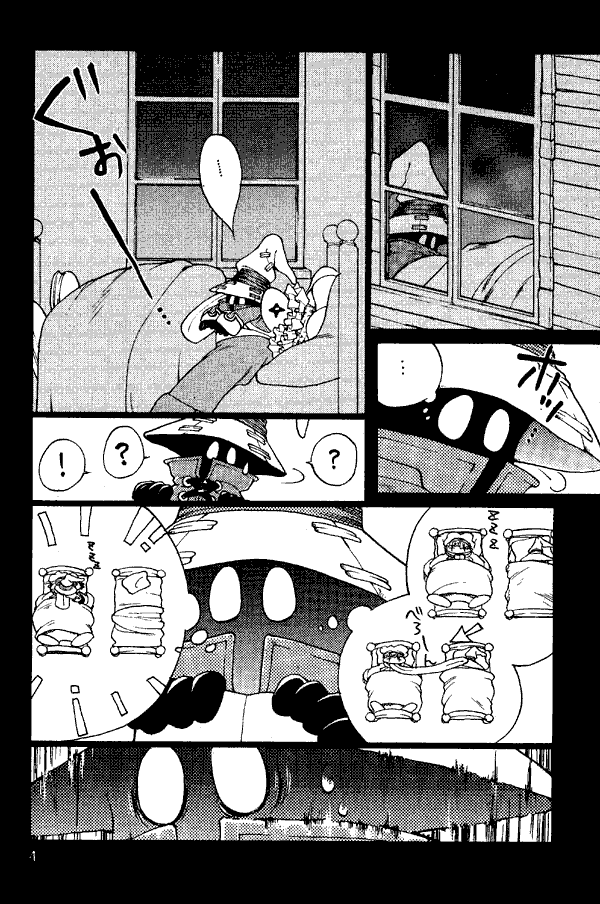 This is a one-story doujinshi. It starts out with Vivi dreaming about being sucked into a sand whirlpool, and when he awakens he's half-in Quina's mouth. S/he's not really eating him, in fact, s/he's asleep. He imagines that s/he snagged him from the next bed with hir tongue like a frog catches a fly, gets alarmed, and leaves the room, looking for Zidane. First he encounters Beatrix, who picks him up like a child to take to the baths with her. Imagining that she is planning to drown him, he struggles until she sets him down again. He doesn't know which of the doors in the hallway leads to Zidane's room, so he starts trying them at random. He finds Salamander's room; Salamander's having a peculiar dream, and his shouting scares Vivi off. Next he finds Steiner's room, and Steiner is dreaming of the battle with the cage plant and grinding his teeth alarmingly loudly. Freya, ever alert, draws her trident in her sleep, and Vivi backs away slowly. Finally Vivi finds Zidane's room, crawls into bed next to him, and conks out.