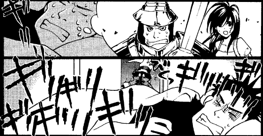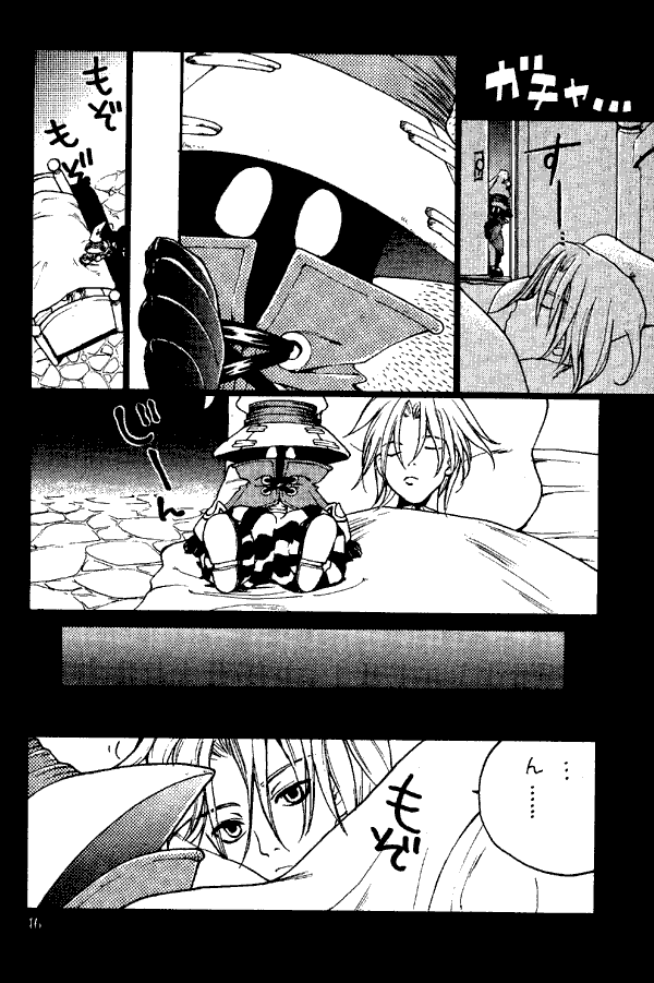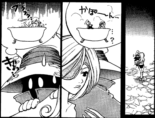 The first time I read this this doujinshi became one of my top favorites. Not only is it a cute story about Vivi that manages to completely avoid killing him off, it's easily understandable no matter what language you speak. There are almost no words until Vivi finds Zidane; the story is carried out in pantomime up until then. When Beatrix offers to take Vivi to the bath and Vivi imagines it's for something other than bathing, the dialogue is carried out in picture rather than verbal form. I expect to have to get out the reference books when I open a doujinshi, so it's an unexpected pleasure to be able to enjoy one just by itself.