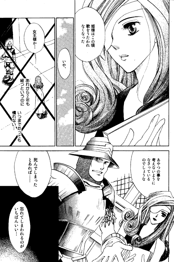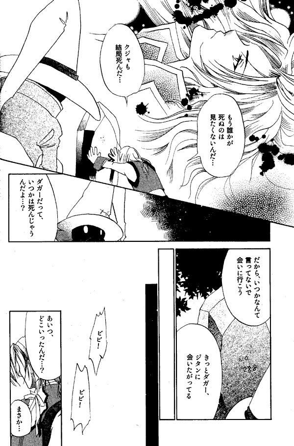 This doujinshi contains "Vivi Mania 2," the first installment of which appeared in Fantasista. Vivi Mania 2 appears to be part of a continuing story, and I wish I could tell what it was about, but... it's very talky, and it'd take a translator to make out all the dialogue. One thing I am pretty sure of is that it takes place after the events of the game. The characters in this story are Garnet, Zidane, Steiner, Beatrix, and Vivi.