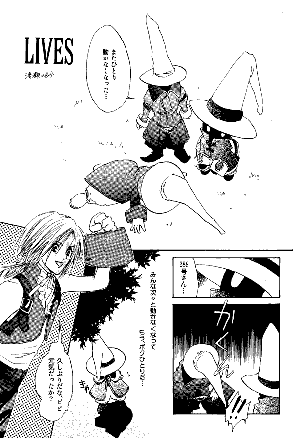 The second story, "Lives," is a bit easier to figure out. At the beginning, Vivi and a Type B Black Mage are looking at a Type A who has "stopped." Vivi addresses the Type B as Mr. 288, but before he can get the whole sentence out the mage also dies. For the rest of the story Vivi and Zidane bury Mr. 288 and talk and mourn their losses.