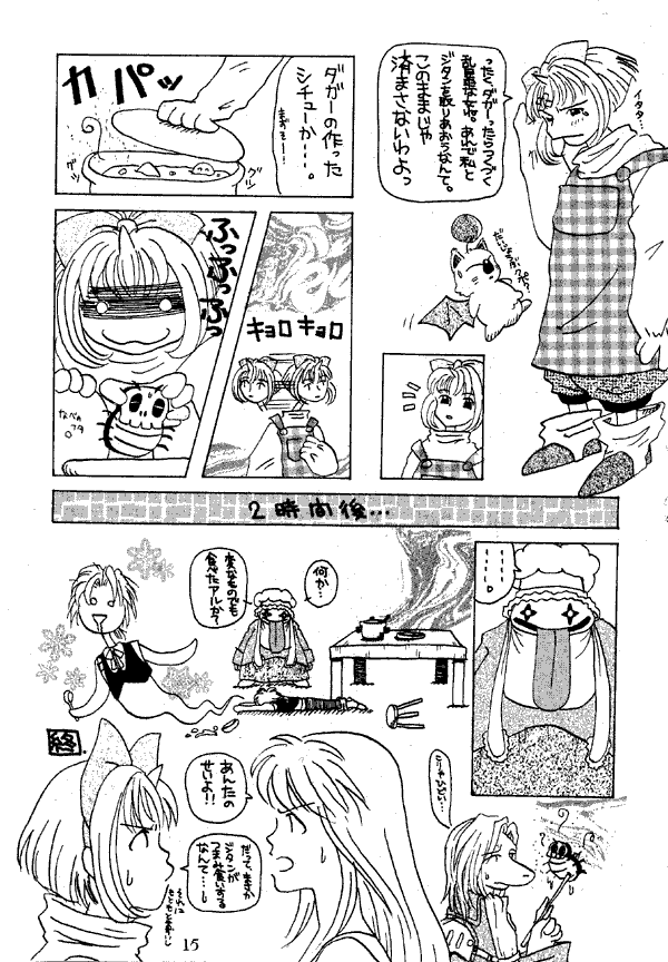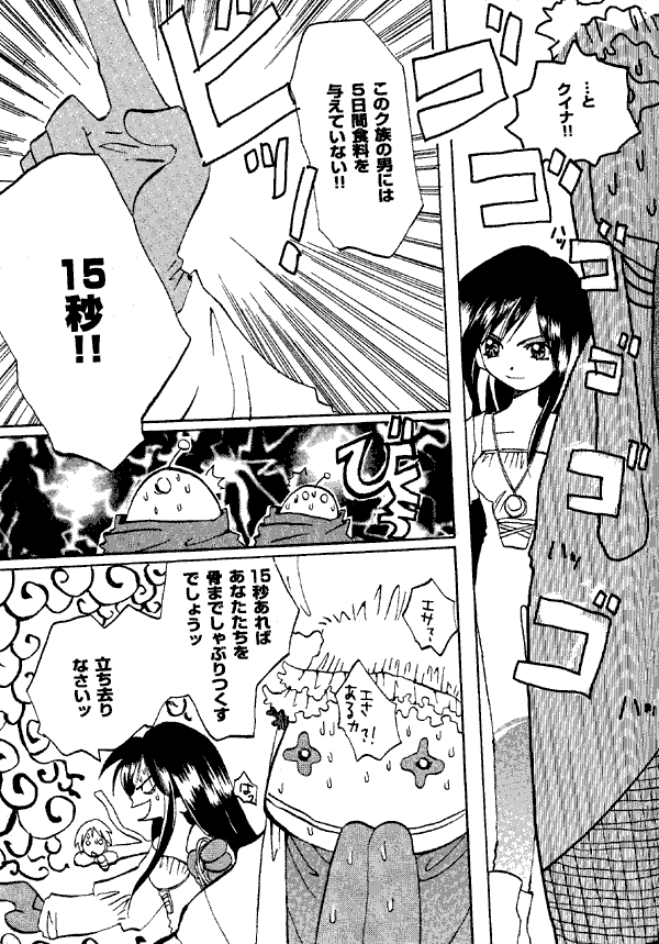 This a short doujinshi with several game-based gags. Faced with killer tonberries, Dagger summons Quina, who terrifies them into fleeing for their lives. Quina, Eiko, and Dagger cook, and both Dagger and Eiko slip ingredients in while Quina's back is turned. The result is quite unpleasant.
