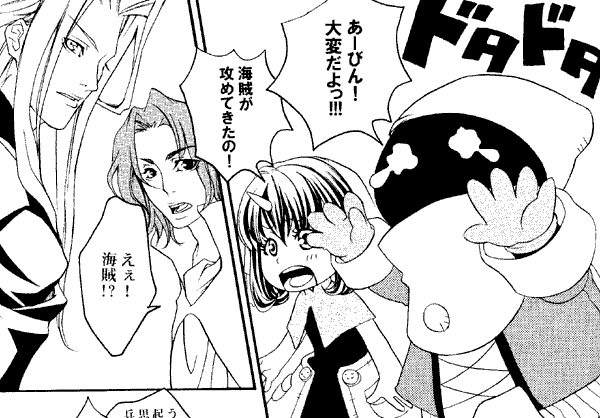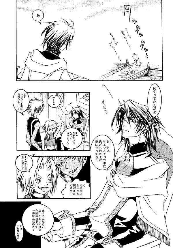 Yes, another 2Capsule Zone doujinshi with characters from a bunch of Final Fantasies all run together in one setting not in any of the original games! This time, instead of being in a school (as in the "Maniac Junkey" series) they are... well, in a kingdom somewhere. Zidane, now about 10 years old, is traveling with Tidus. They meet with Prince Squall, then go to "Zelda Village," and... meet other characters, and other stuff happens. There's also a scene with Vivi and Eiko, also in weird court costume, bursting in on what might have been an intimate scene between and Sephiroth. This being a 2Capsule Zone doujinshi, Vivi has to cry hysterically.