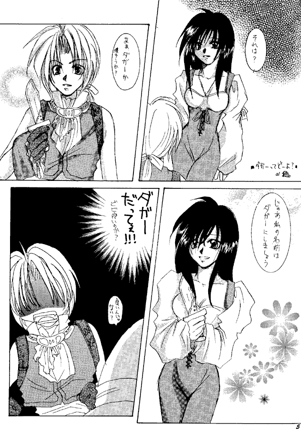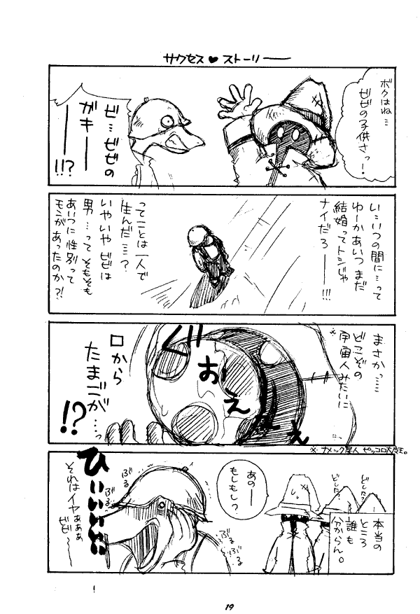 Inside is a collection of gags. The way Garnet fingers Zidane's dagger while discussing her image change makes him quite nervous. Zidane undoes Eiko's hair ribbon and finds that her head is full of tiny moogles. Kuja sees Zorn and Thorn without their makeup and false noses, and they're actually fairly cute. When Puck meets Vivi's son he has a nightmare vision of a huge mage egg coming out of Vivi's mouth.