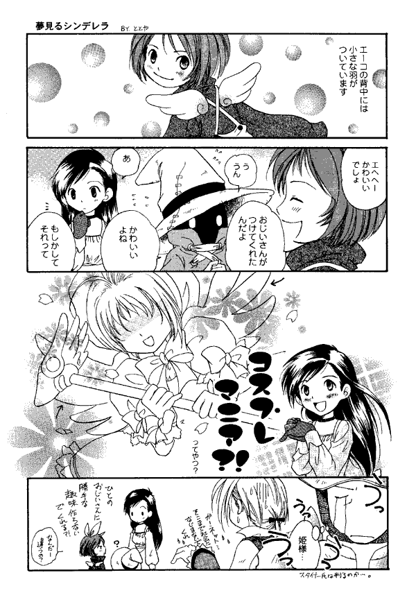 This is a simple gag book. Most of them are talky, but there are a few that come across visually, such as when Garnet sees Eiko's wings and imagines her doing a Sailor Moon-esque cosplay. In another Quina ruins Zorn and Thorn's cooking, so Kuja's dinner ends up being a frog. There are also one-page drawings - a collage of various game enemies, Zidane and Garnet, the Tantalus crew.