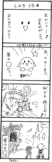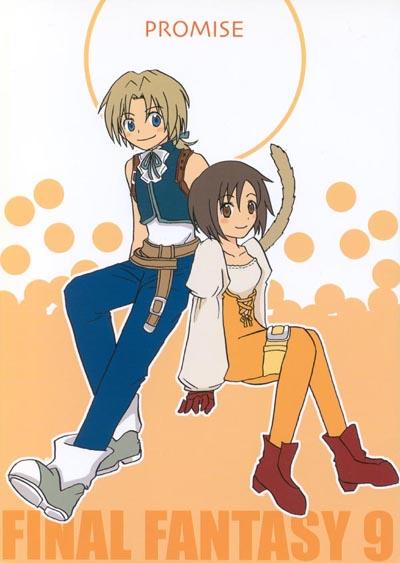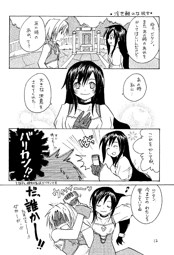 This doujinshi has a number of gags I liked, for example Quina having a problem with the "protect girls" thing - apparently s/he should have been protected, and Zidane never knew it. In another Dagger is about to cut her hair - and Zidane forcibly restrains her from using the kind of electric razor they give Army buzzcuts with. There are also some small four-panel gags, including one starring Kirby as Atomos. There's also one in which Vivi is holding everything up by skipping rope - and his score is over 1000. (I know that has to be a joke - I could never even get him to 20!)