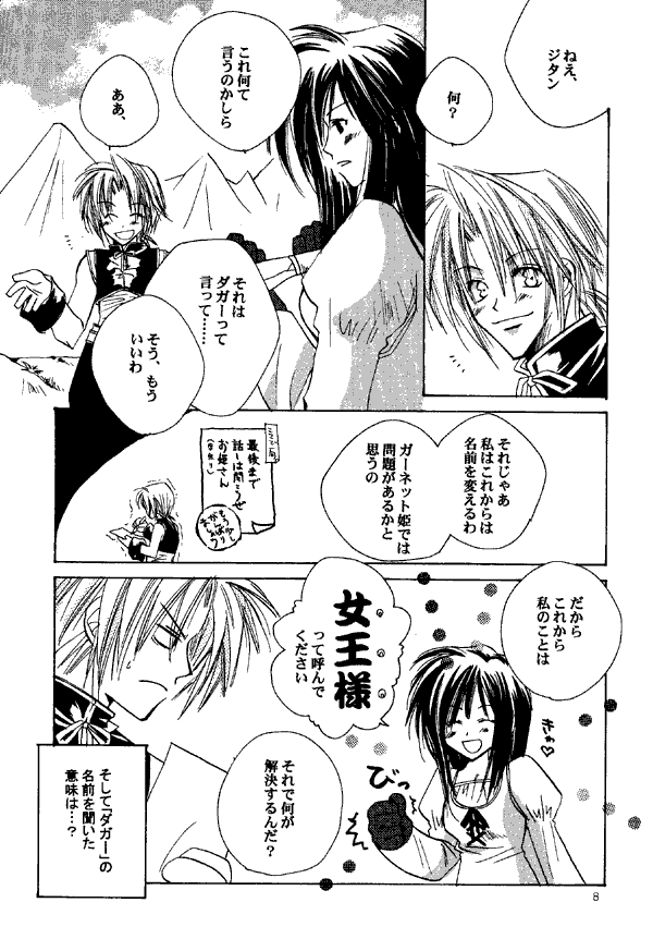 The events of this doujinshi take place in Dali, starting from when they emerge from the ice cavern and see the city in the distance. Dagger renames herself (apparently to something that doesn't exactly thrill Zidane). They go into town, Dagger talks to the shopkeeper to learn how to speak informally, and later the two talk while Vivi and Steiner watch from hiding.