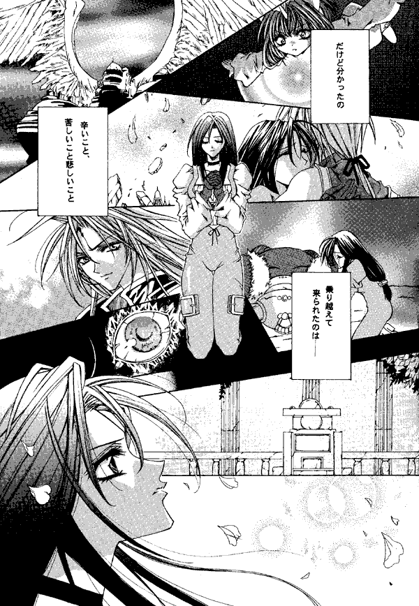 There are several stories in this doujinshi. The first, "Trust," is about the chase through the Evil Forest and Blank's petrification. The second, "Calling You," is about Kuja and the younger Zidane. Kuja appears to want to get rid of his little brother, but just can't bring himself to do it. Instead, he leaves the kid, asleep, on the steps of a building in Lindblum near Tantalus's headquarters. "Melodies of Life" is about what led up to Garnet's decision to change her image (the hair-cutting scene). The last, "First Impression," is lighter in tone, and follows Eiko's attempts to cook a meal for Zidane. In the one gag, "Bibi no Daibouken" (Vivi's Big Adventure"), Vivi sees Kuja's silhouette as he takes a shower. He's pulled his tail around front to wash it, and the resulting silhouette shocks Vivi. Just imagine it, I'm sure you'll get it right.