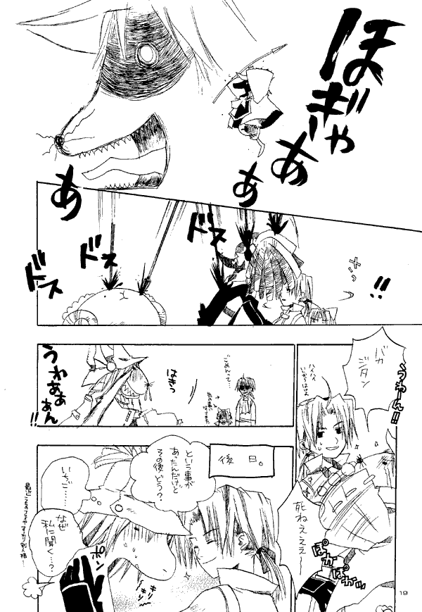 This doujinshi starts out with a set of game-related gags, most of which I unfortunately can't make sense of, as the jokes are mostly in the text. (Vivi throws his own head at a tonberry? Zidane steals what looks like a mutant rabbit from Kuja? Your guess is as good as mine, especially because these bits are hand-lettered and trying to interpret handwritten Kanji is not a task for the faint of heart.) I was able to get bits here and there; for example, when Zidane grabs Freya just as she leaps and ends up holding her trousers, the sound effect is "zubooo" - zubon being the Japanese word for pants. (The indignity of being pantsed in battle sends Freya into a trance, which is a good thing, as they're fighting a yan at the time.) There are also some more serious stories, including a conversation between Zidane and Vivi, and one in which Zidane ends up looking at what appears to be a small grave(?) marker with "Zidane no baka" written on it.