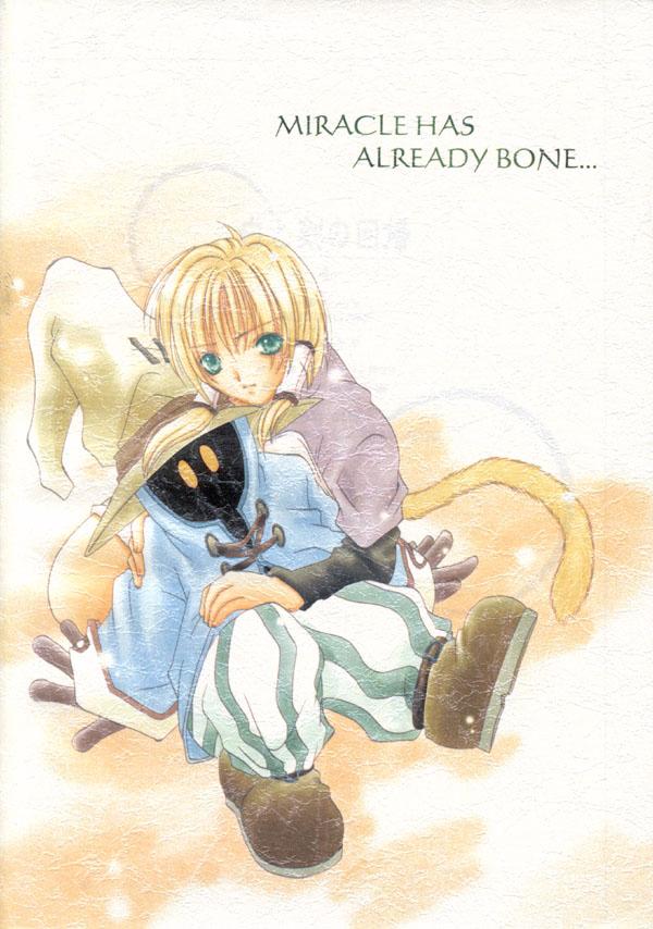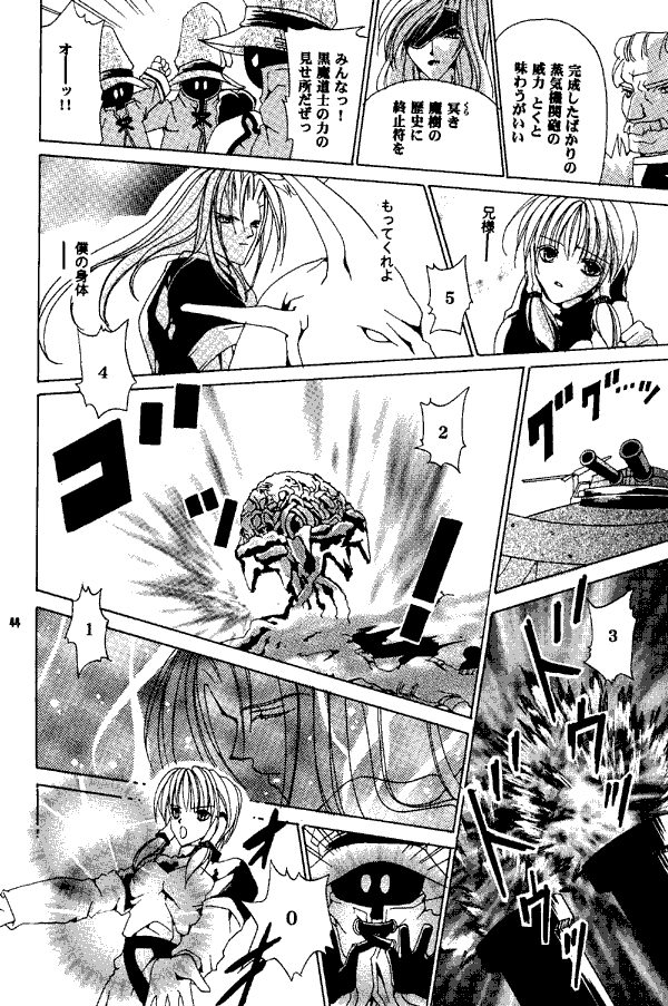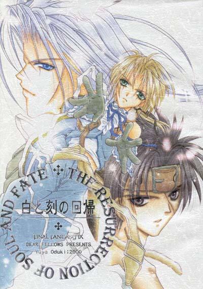 There is just one story in this doujinshi, but it's a long, ambitious one. Kuja, Tantalus, the military forces of Alexandria and Lundblum, the magic of Micidia (Mysidia, in which the Genomes and Black Mages now live), and of course Our Heroes team up to destroy the Iifa Tree once and for all. Which seems like a pretty good idea, considering what its real function is, doesn't it? In this story Mikoto seems to have gained magical powers. The Black Mages are led by a Vivi-type mage named Zaza. (Where is Vivi? He is discussed at some length more than once, but he doesn't appear on camera as far as I can tell. I fear that, as in so many other stories, he's dead. If so, we're spared the usual image of his hat on a grave marker this time around.)