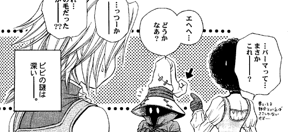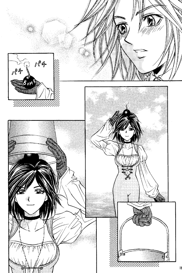 This doujinshi is mainly gags based on the events of the game. Eiko puts her jewel in her ear and afterwards cannot hear (a la "I can't hear you, I have a banana in my ear!"). Dagger cuts her head off instead of her hair and stands there like a horror movie monster, holding her head by its hair while blood fountains out of her neck. Ash casts "Stop" on Zidane, and Black Mages see that he's no longer moving and start burying him while Vivi protests. Dagger cuts her hair, then puts a small bomb on her head and covers it with a bucket, which results in a perm. Vivi also gets a perm - which, in his case, means that the tip of his hat is curled into a little spiral.