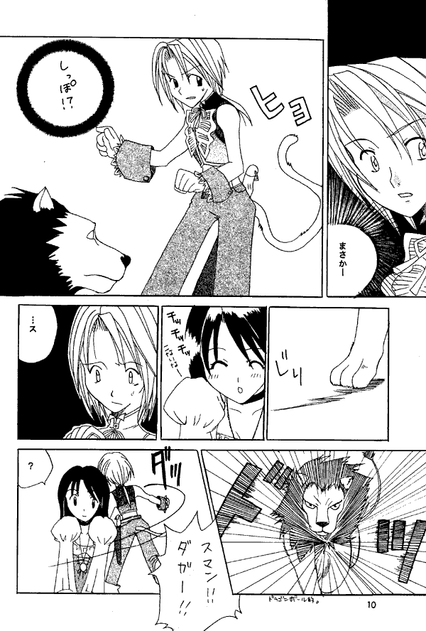 In this doujinshi's main story, Garnet finds herself a pet. Her "kawaii neko" is actually a lion, but the others don't seem to be able to convince her of that. After it attacks Zidane (who is saved by a quick Bahamut summon - and, don't worry, the lion survives that) she realizes that lions don't make good pets. She soon finds another one - a Gimme Cat.