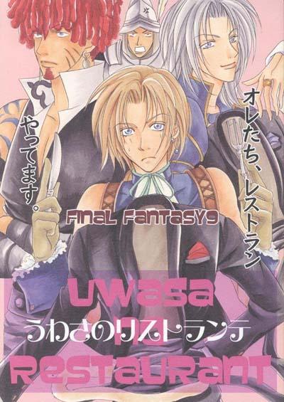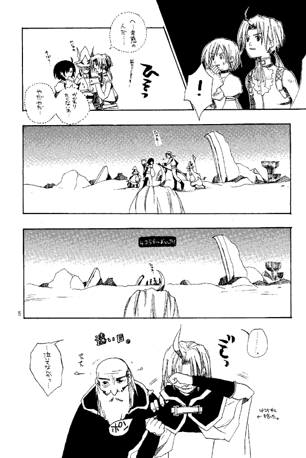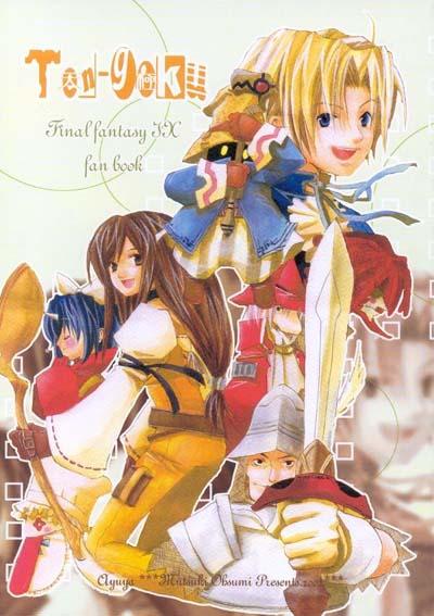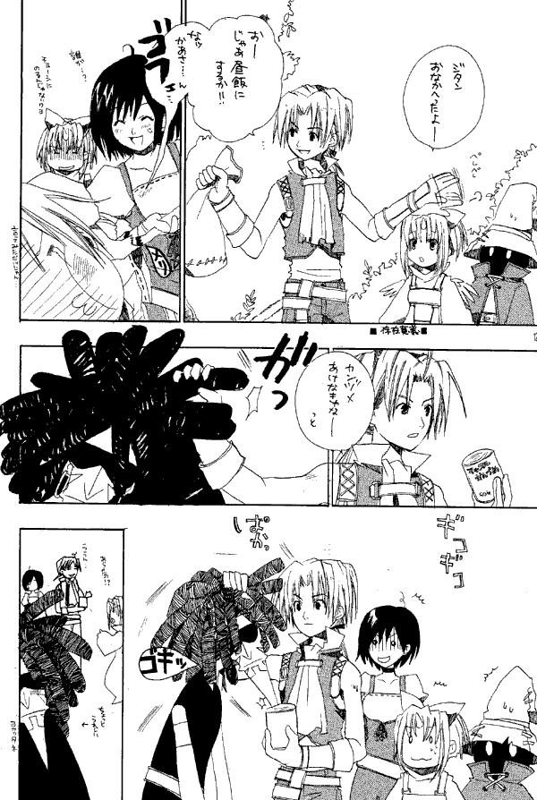 This doujinshi has a number of game based gags. In one, Salamander flees from the team at the base of the Iifa Tree because he is level 26 and the rest are at level 45. Later in this story Ramuh, both as the apparition in the Pinnacle Rocks and the summoned eidolon, and Garland. I couldn't tell as much as I'd like to about this story, but it did include a cute gag involving a new use for Salamander's beard, and at the end of the battle with Kuja and Garland... Zidane's group runs away, leaving behind 425 gil and a very frustrated Kuja. In the serious story, Zidane is injured while covering Dagger in a battle against a strangely drawn birdlike thing, and afterwards he and Dagger converse as he recovers.