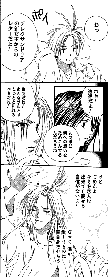 The doujinshi starts out with several gags that, well, I haven't been able to piece out because of high talkiness-to-action ratio. There is a segment in the middle that I also haven't been able to decipher the plot of, but I don't really need to - it's Kuja loafing around an apartment in his underwear and an open robe, showering, reading his mail, drinking out of a milk bottle, and generally looking very bishonen. That in itself is amusing enough for me.