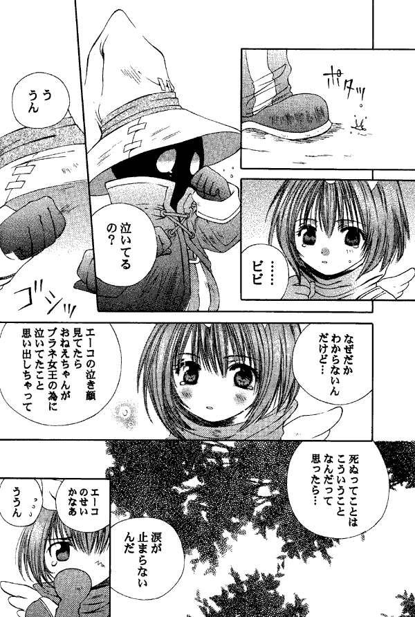 One of the serious stories is a conversation between Zidane and Dagger. The other, "Tears," is a conversation between Vivi and Eiko in which they talk about the loss of their loved ones. When Vivi remembers Garnet crying after Queen Brahne died, he is brought to tears.